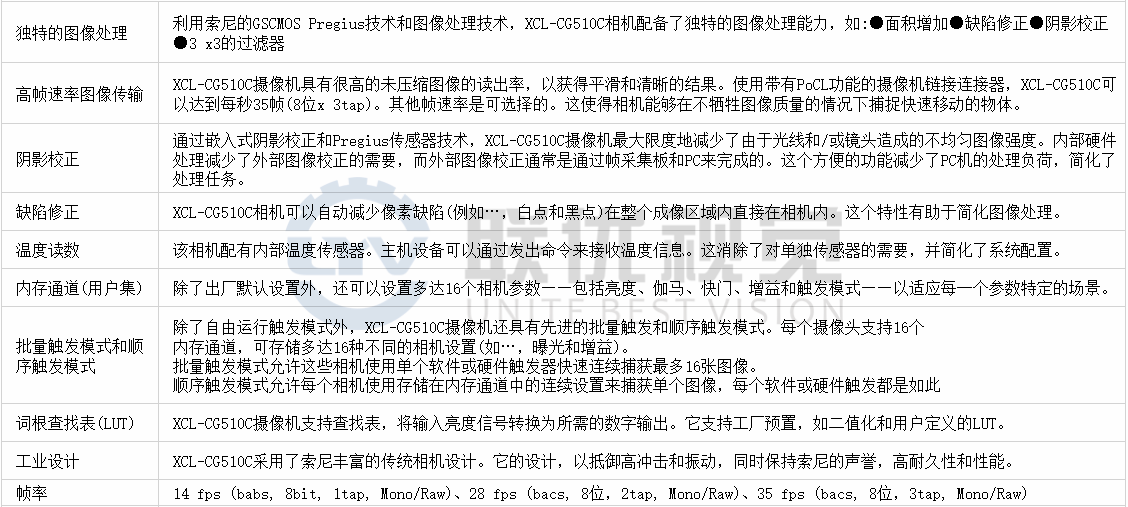 ●XCL-CG510C(彩色)結合了索尼技術的優(yōu)點,具有較高的色彩還原度,在工業(yè)視覺和非制造視覺市場中都得到了優(yōu)化。