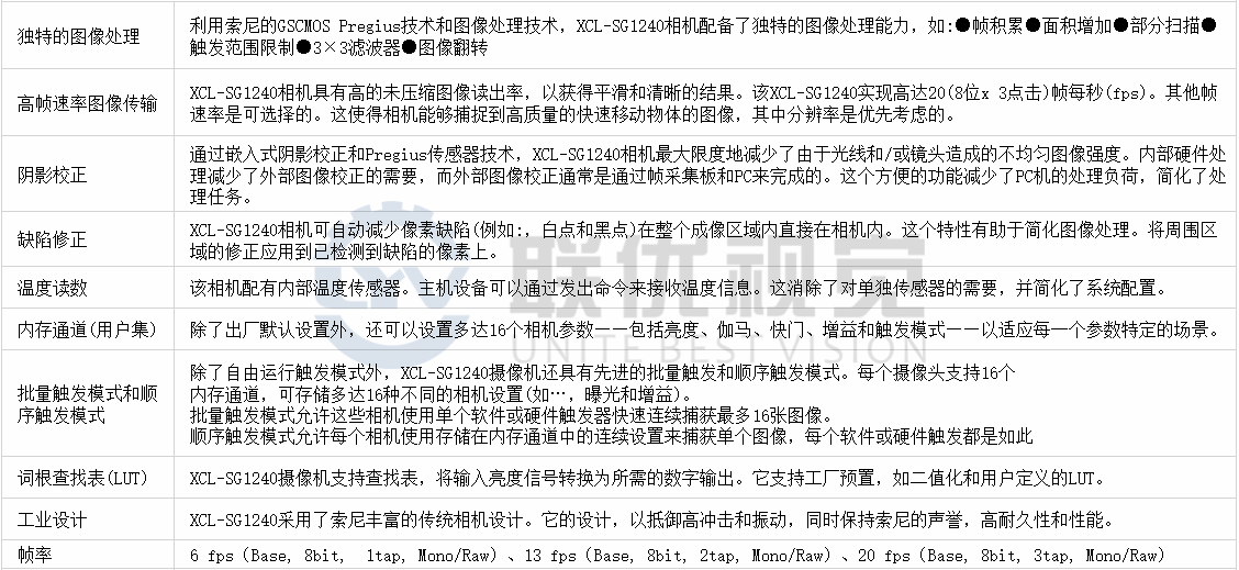 ●該XCL-SG1240(黑白)結(jié)合了索尼技術(shù)的最佳在一個(gè)方便的形式因素,這是優(yōu)化的工業(yè)視覺(jué)和非制造的視覺(jué)市場(chǎng)使用。
