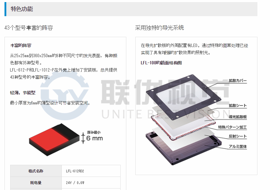 LED嵌入在方形光導(dǎo)漫射器的外圍。從平坦的發(fā)光表面照射散射光。薄型設(shè)計(jì)的最小厚度為6mm(LFL-612 / LFL-1012 / LFL-50),可以節(jié)省空間。