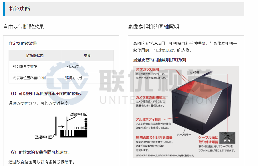 通過使用半反射鏡,來自LED的散射光與攝像頭軸同軸落下。均勻地照射鏡子的工作。擴散板可定做。