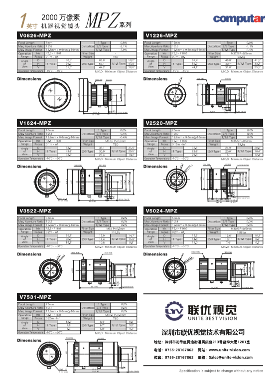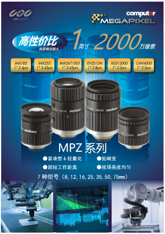 日本CBC旗下Computar鏡頭發(fā)布新款MPZ系列機器視覺鏡頭,該款鏡頭最大支持1英寸靶面同時具有2000萬像素,共有7款型號選擇(8mm、12mm、16mm、25mm、35mm、50mm、75mm),在外觀及功能上具有緊湊型&輕量化、低畸變、超短工作距離、視場亮度均勻等特征,匹配在IMX183、IMX255、IMX267/305、EV2S12M、XGS12000、CMV4000等芯片上,適用范圍:機器視覺、工業(yè)自動化,智能交通,道路監(jiān)控等。