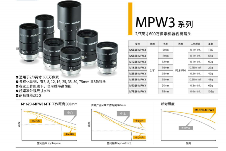 日本CBC旗下Computar鏡頭發(fā)布新款MPW3系列機(jī)器視覺鏡頭,該鏡頭最大支持2/3英寸靶面同時具有600萬像素,共有8款型號選擇(5mm、8mm、12mm、16mm、25mm、35mm、50mm、75mm),在外觀及功能上具有緊湊型&輕量化、低畸變、超短工作距離、視場亮度均勻等特征,匹配在IMX250、IMX264、IMX178、RJ3254、S3AA0DK、ICX625、EV2505M等芯片上,適用范圍:機(jī)器視覺、工業(yè)自動化,智能交通,道路監(jiān)控等。